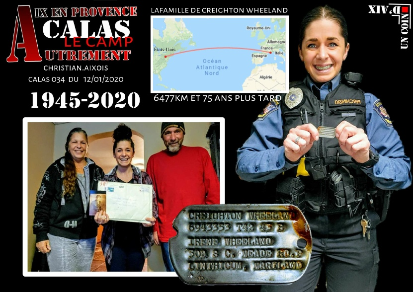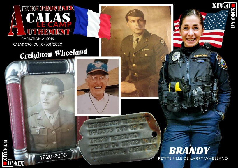 6477km et 75ans plus tard, cette jeune américaine entre en contact avec christian.aixois afin de prendre possession de la plaque d'identité militaire perdu en 1945 sur le plateau de l'Arbois " Le Réaltor" Camp de Calas" et que Christian a trouvé. Opération réussit, Brandy petite fille de Creighton Wheeland à pu offrir à sa maman et son oncle la plaque de leur Père.Une histoire toute simple, pleine d'émotion.