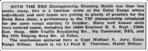 Avec le DBS Championship Shooting Match, dans mons de deux semaines, c'est une scène familière au Calas Range où les individus et les équipes de l'unité s'entraînent abondamment pour le tournage de la Delta Base, un préliminaire au championnat TSF programmé pour la même gamme à partir du 15 octobre. De nombreuses unités bien connues ont rejoint des équipes, y compris le 360th Engineer GS Regt, le 220th Gen. Hosp, le 40é BN Regulation de trafic, le Ha Command DBS, et le 25th Staging Area Bn à Calas . Le tireur d'élite photographié ici est le Capt Michael A. Jury, Officier de la base Calas . L'entraîneur est 1er Lt Paul E. Thornton, officier de match.