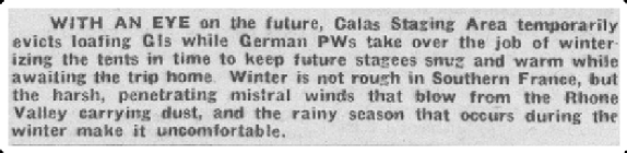 A Calas Staging Area la zone de transit , on expulse temporairement ceux qui flânent. Tout allemand PG doit prendre en charge le travail pour se prémunir de l' hiver. On renforce les tentes à temps pour se protéger et rester au chaud. L'hiver n'est pas rude dans le sud de la France, mais les vents violents et pénétrants du mistral qui soufflent de la vallée du Rhône transportant de la poussière et la saison des pluies de l'hiver rend le camp inconfortable.