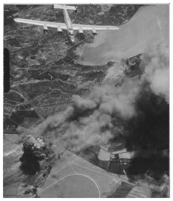 Une grande formation de B-24 Libérateurs du 15 AAF a bombardé le Miramas triage, 20 miles au sud-est d'Arles, dans le sud de la France, le 6/8/44 coupant les voies et détruisant à moitié de la gare. La fumée s'élevant de la zone cible couvre les cours.